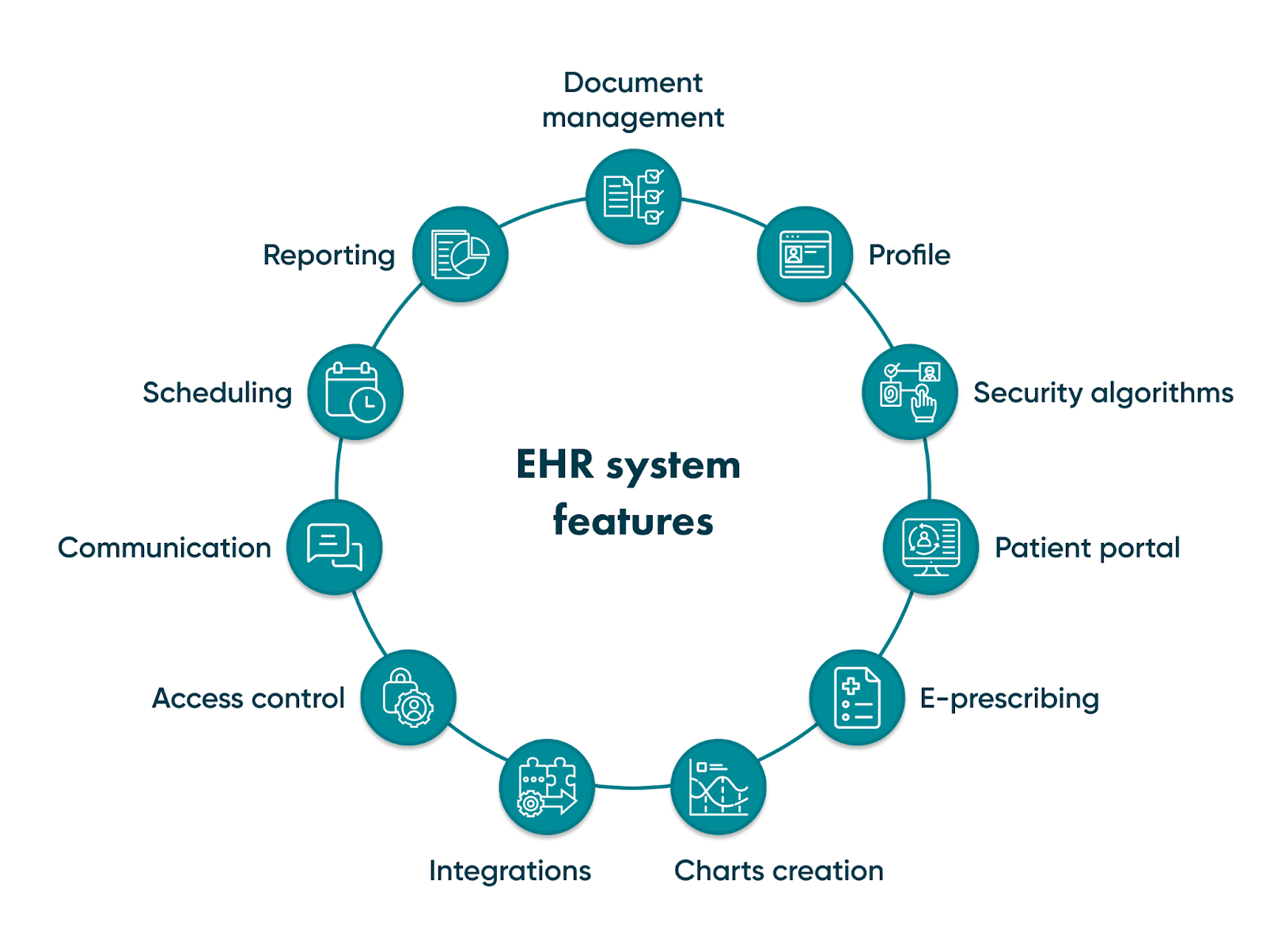 The main components of EHR are document management, patient portal, user profile, chart creation, integrations, access control, reporting, scheduling, and messaging.