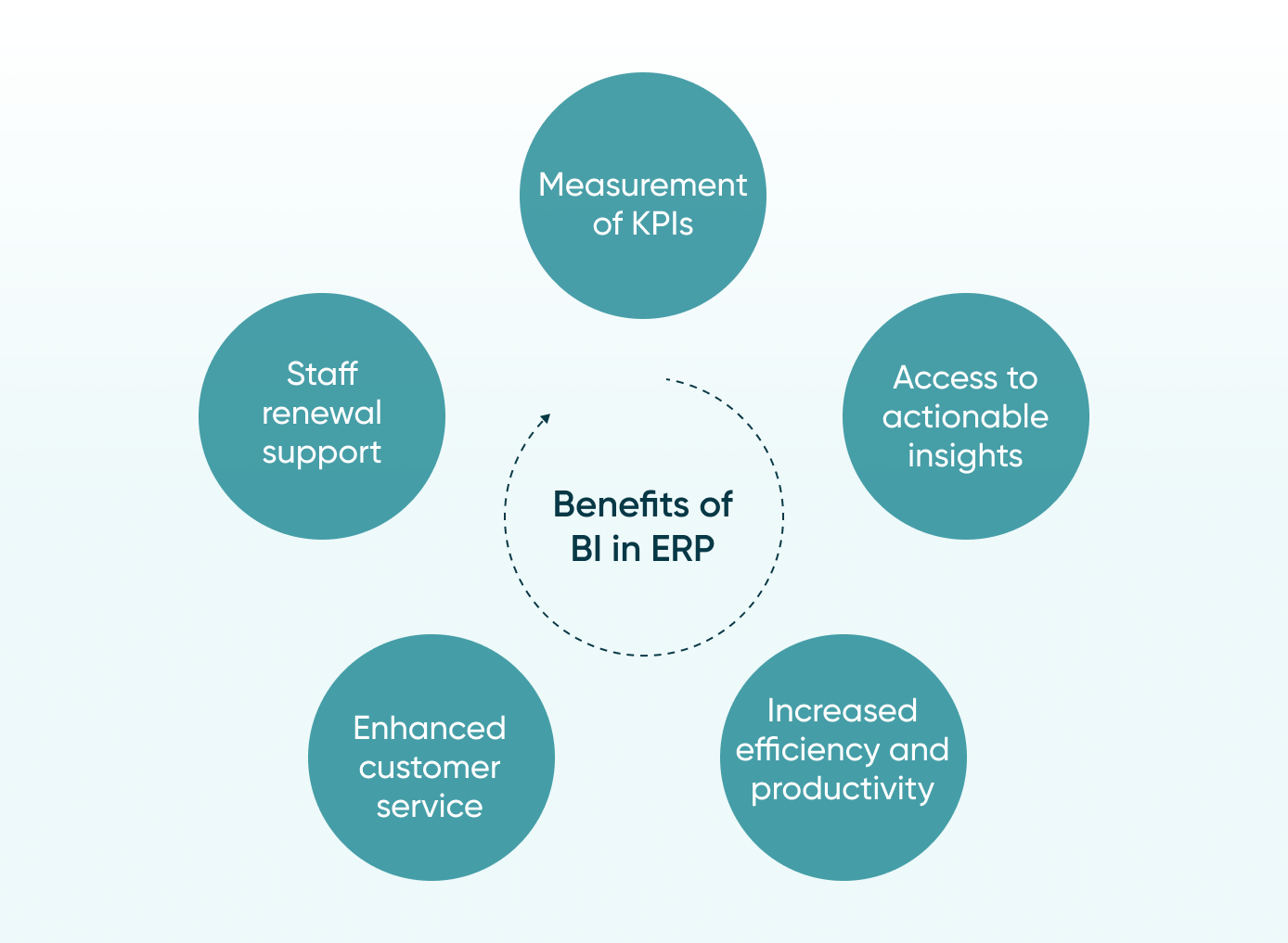 Business intelligence in ERP systems offers benefits such as the measurement of key performance indicators, access to actionable insights, increased efficiency and productivity, enhanced customer service, and support in staff renewal.
